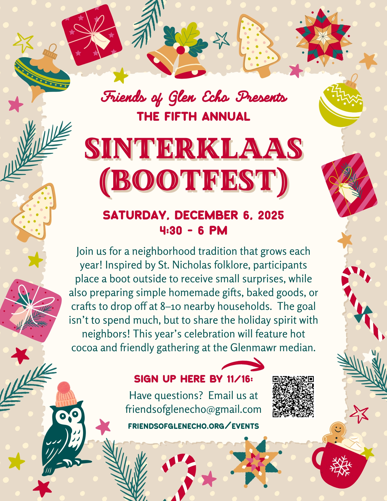 ConfirmedJoin us for a neighborhood tradition that grows each year! Inspired by St. Nicholas folklore, participants place a boot outside to receive small surprises, while also preparing simple homemade gifts, baked goods, or crafts to drop off at 8-10 nearby households. The goal isn't to spend much, but to share the holiday spirit with neighbors! This year's celebration will feature hot cocoa and friendly gathering at the Glenmawr median.